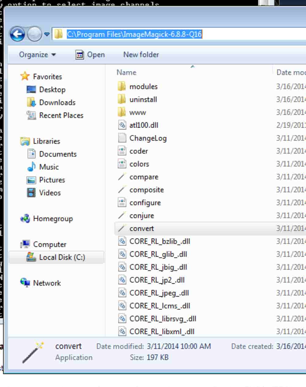 Once you have that installed, check if it worked by opening up the command prompt (start->cmd) and type convert. You should see a few hundred lines scroll across your screen.