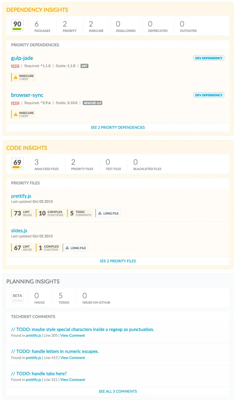 The JavaScript ecosystem is moving very quickly right now, and keeping your dependencies up to date can be a headache. Knowing when both your own code and your dependencies have bugs, security flaws, or just general code smells isn't as easy as it used to be. We need to know if anything in our project is insecure, deprecated, outdated, or unused.