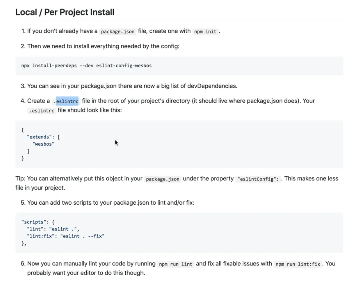 We are going to follow the instructions located at https://github.com/wesbos/eslint-config-wesbos.