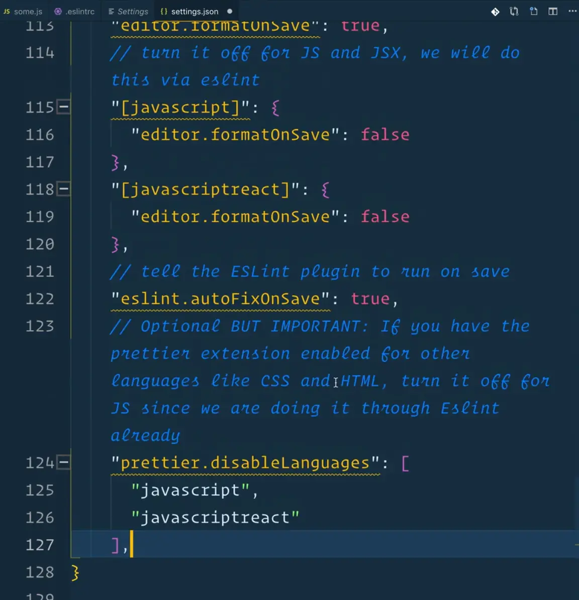 The setting above 👆 is responsible for turning off formatting on save for JavaScript. We will format JavaScript code using ESLint.
