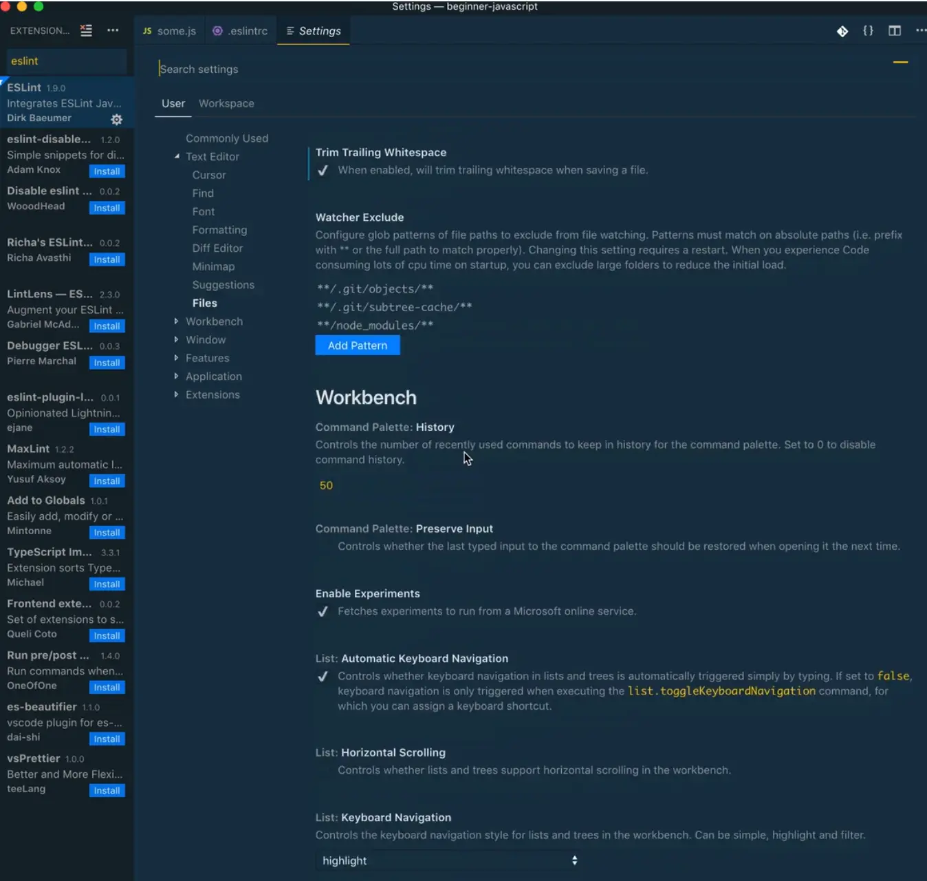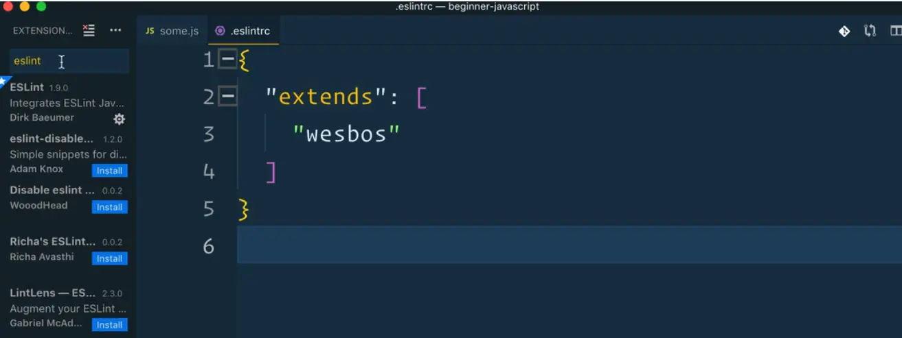 Next we need to make a new file within the beginner-javascript folder called .eslintrc. This is what is called a dot file.