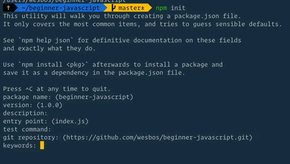 You will now be prompted to enter a package name, description, keywords, etc. but you can just press enter to skip setting those values for now.