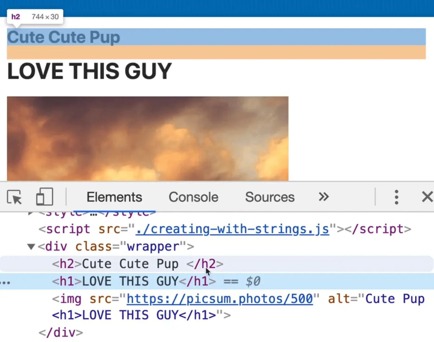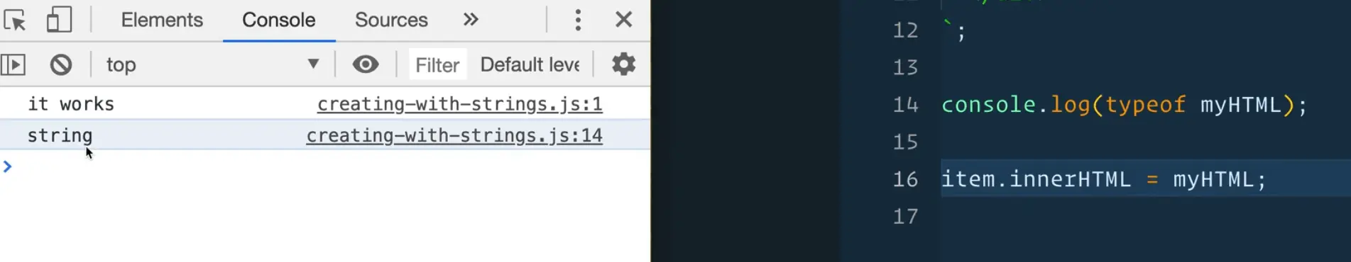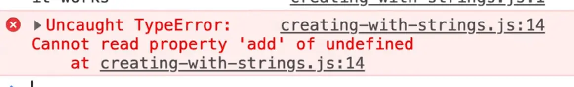 Create a new JavaScript file creating-with-strings.js and change the script src in the index.html file to point to our new file.