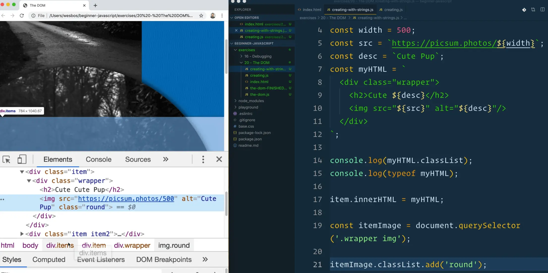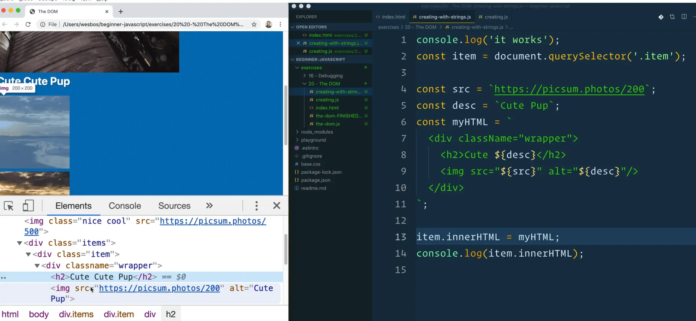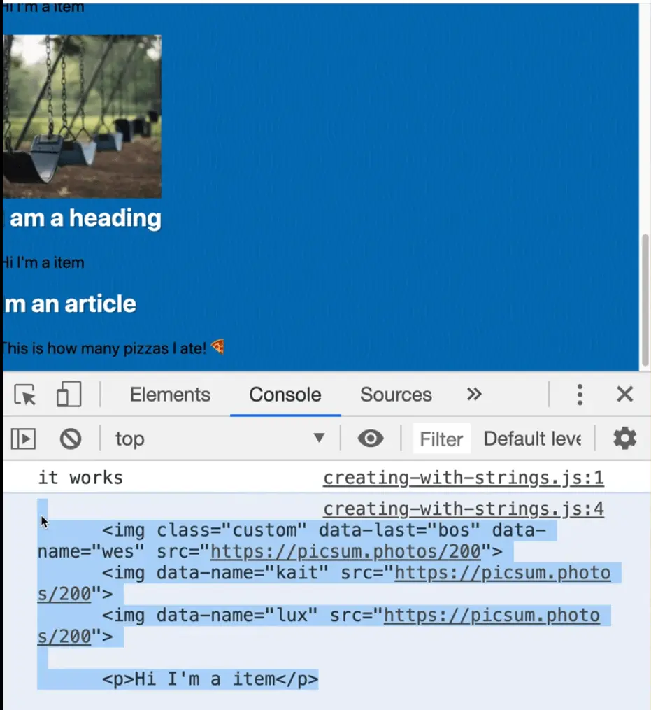 We are going to learn about creating HTML with strings, using backtick strings, which Wes showed us earlier.