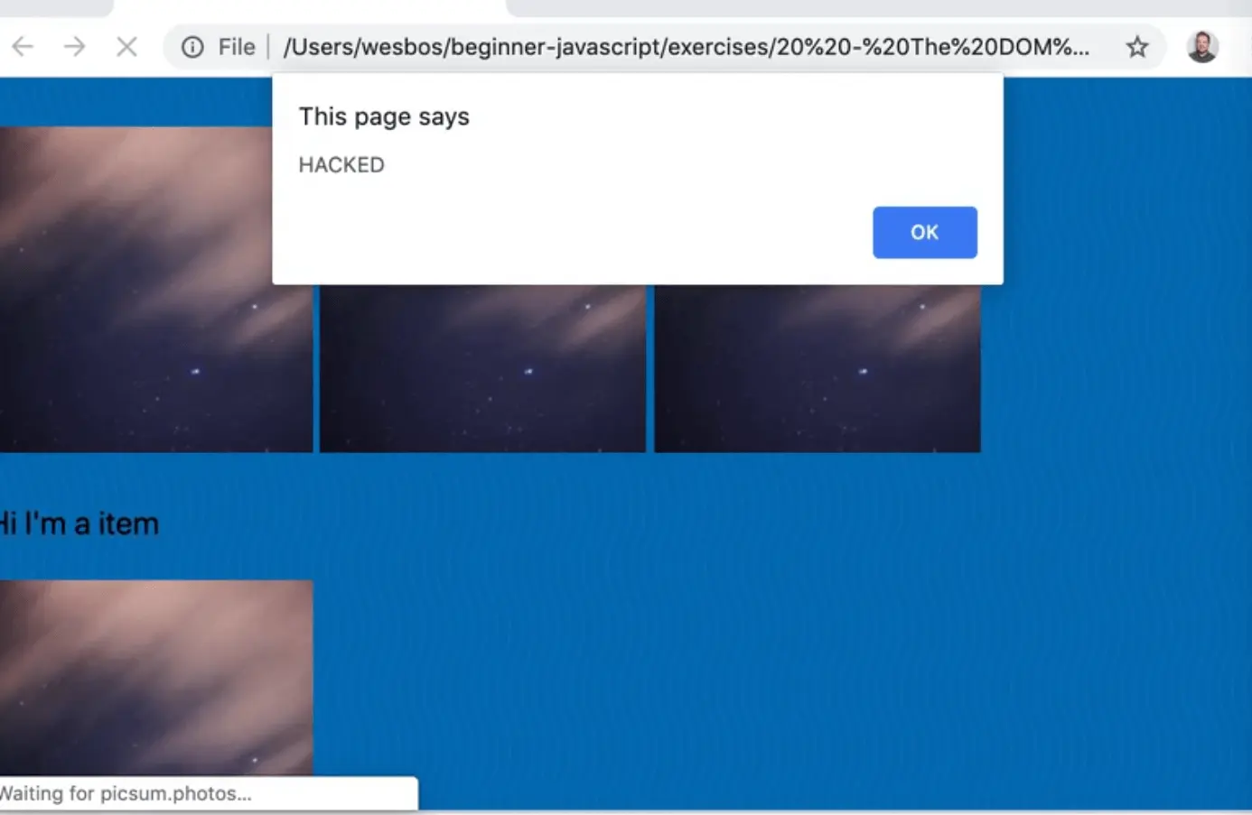 const desc = `Cute Pup <img onload="alert('hacked');" src="https://picsum.photos/50"/>`;