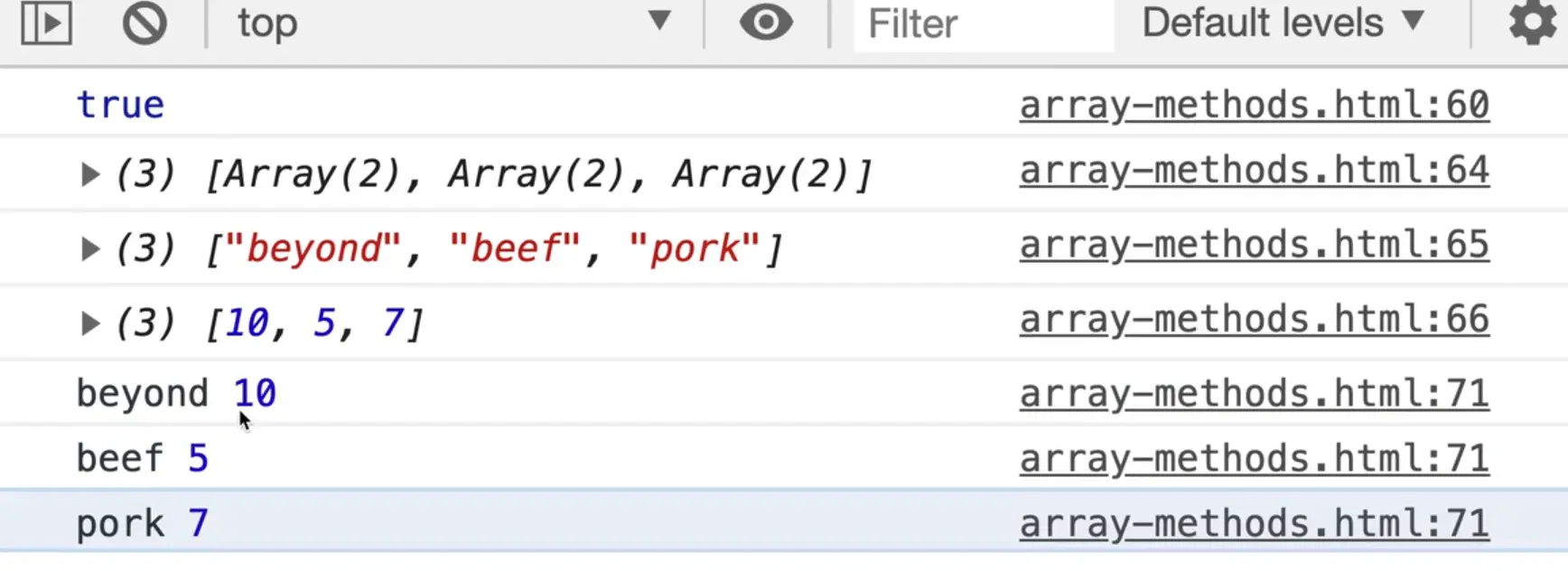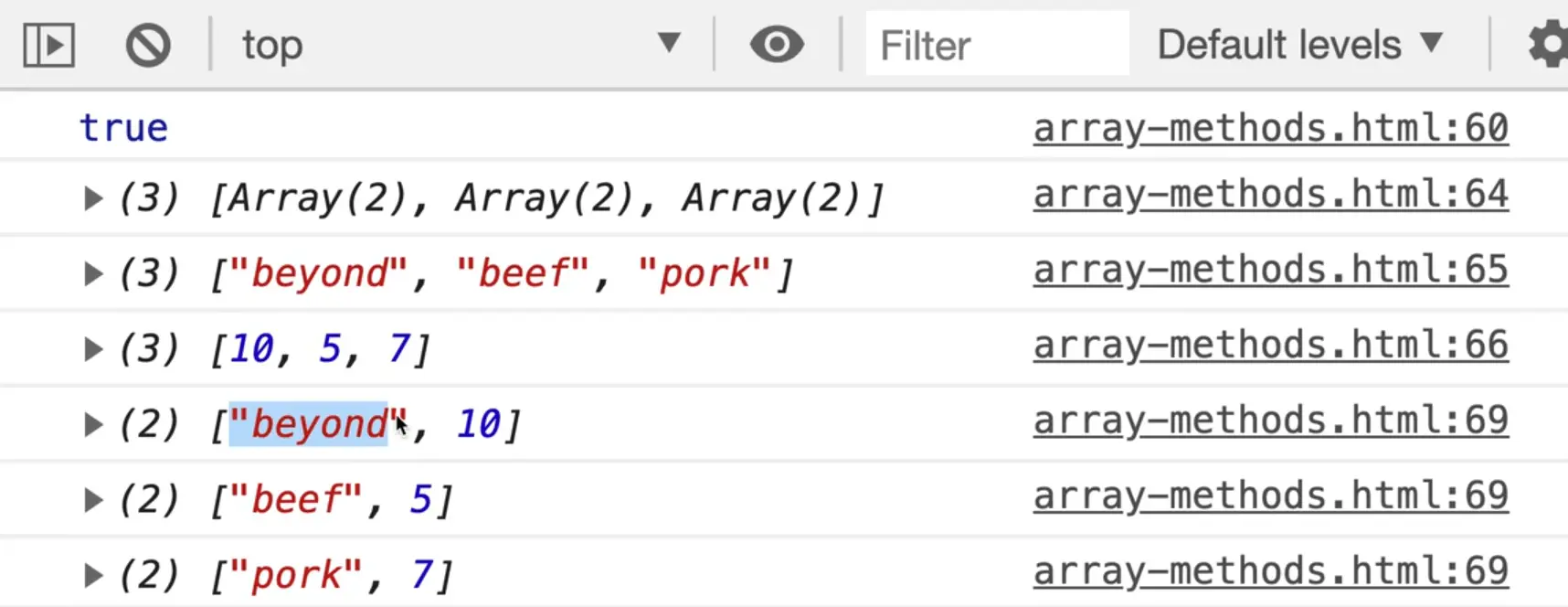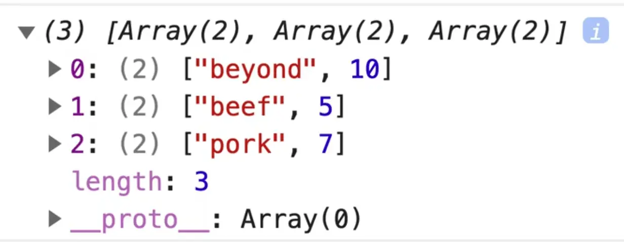This exercise requires us to take the meats object and make 3 arrays with .entries(), .keys(), .values().