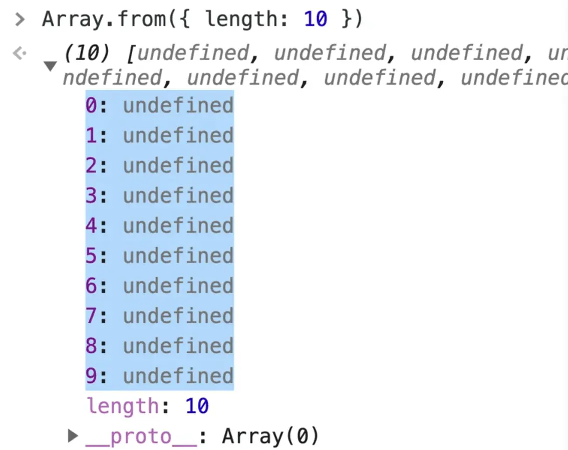 What that will do is it returns an array from that iterable with that many empty slots. So in the example above, you are saying you want 10 spots, and that returns to us an array with 10 empty spots.