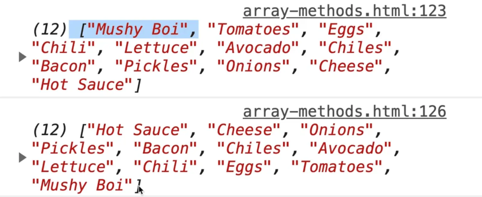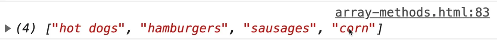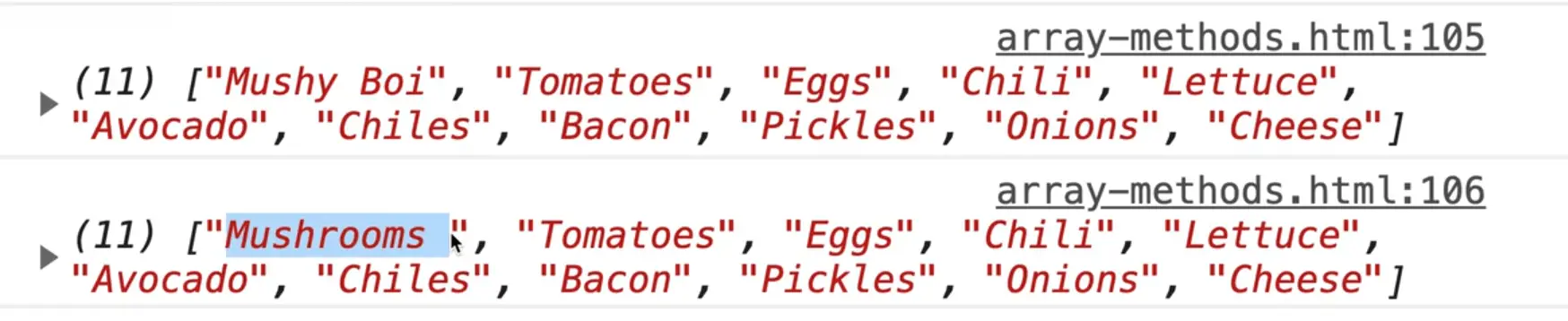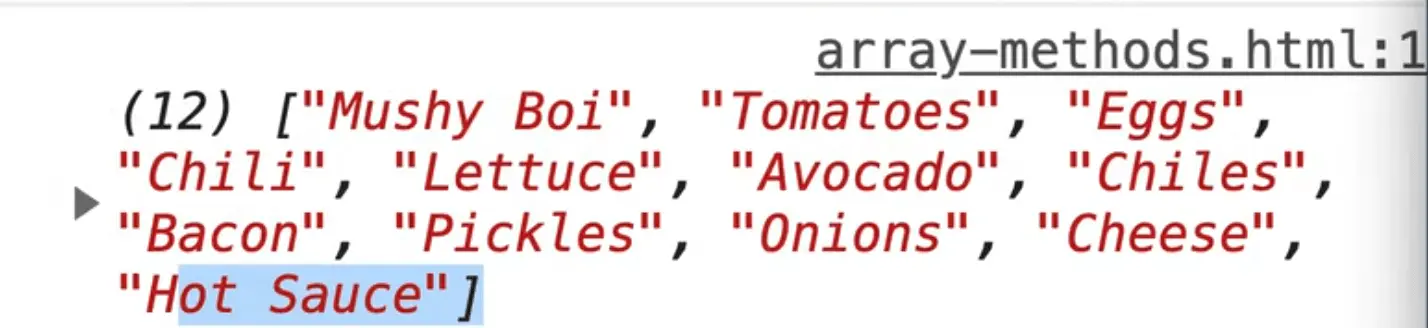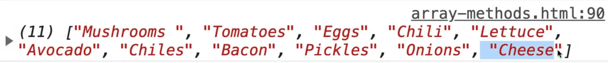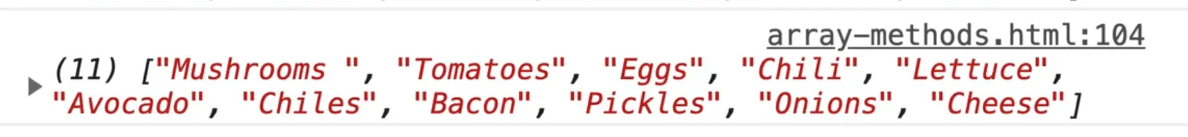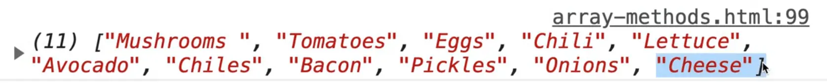 If you refresh the page you should see "5" logged in the console. That tells us that the avocado item is in the 5th index.