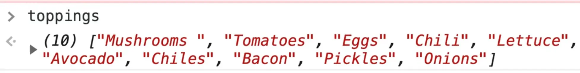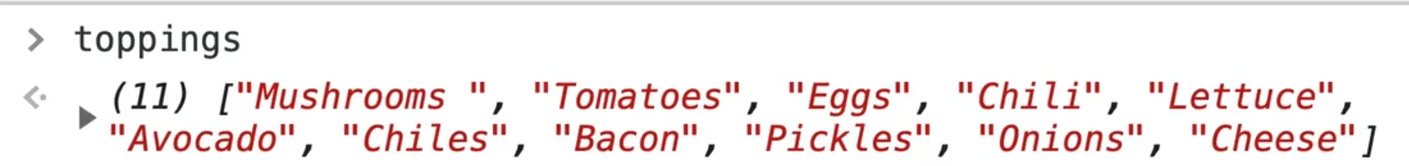 Let's look at the toppings array in the console.
