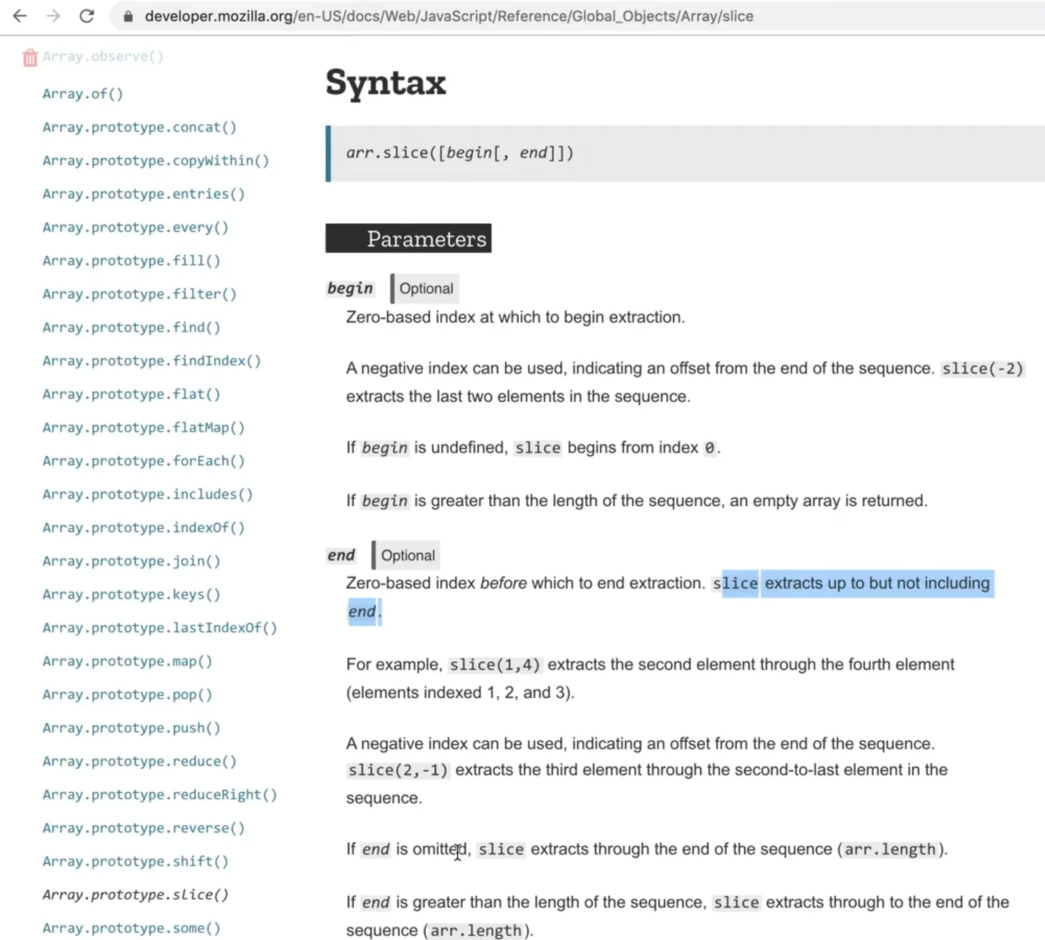 It says that end is optional. If it is ommited, slice extracts through the end of the sequence, so we don't need it!