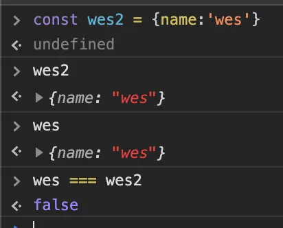 When we called indexOf(wes), it was checking whether the people variable contained a reference to the object wes, which it did. When we checked it for an object that just looks the same, it gave us false. That is the whole reference vs value thing again.