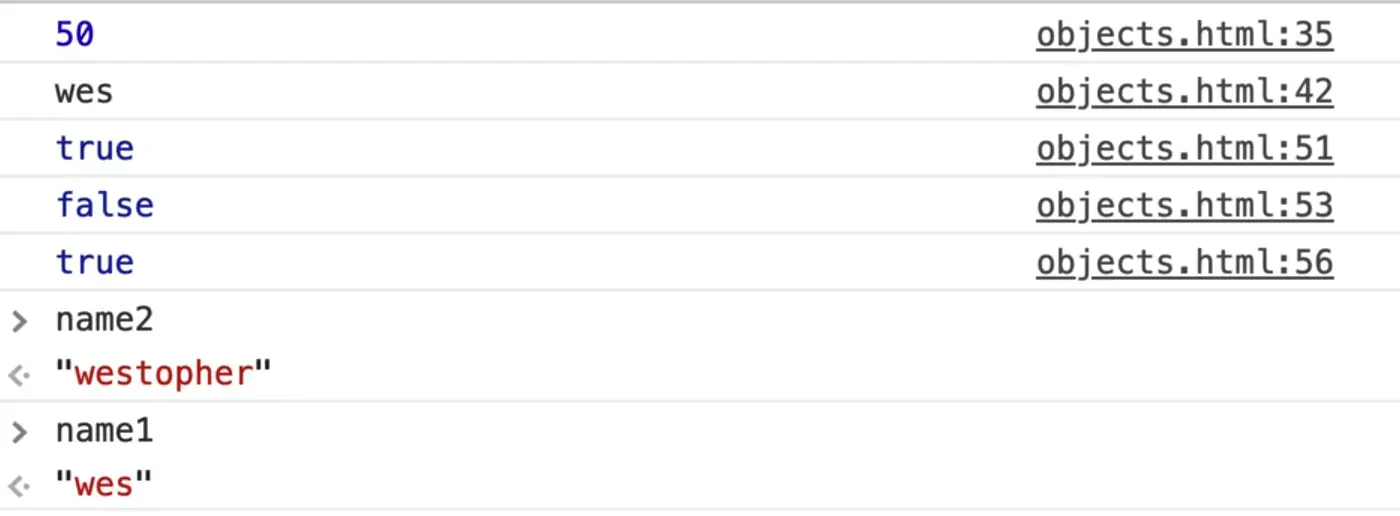If you refresh the HTML page and open the console, if you try typing in person1 === person2 you will see it is returning false.