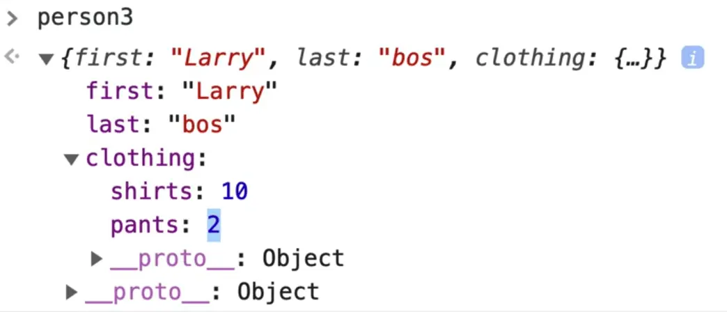 If you try to update person3.clothing.shirts = 100; and then view the object in the console, you will notice that person3.clothing.shirts does equal 100.