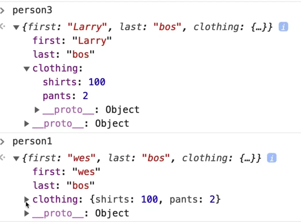 However if you look at person1, you will notice that person1.clothing.shirts was also updated to be 100.