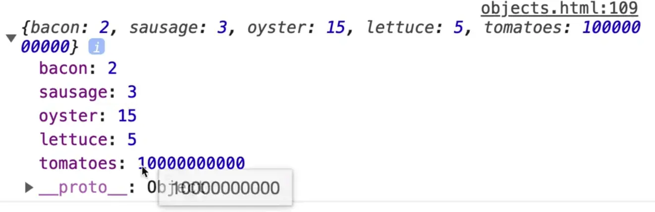 So we have these 2 objects, meatInventory and veggieInventory, both of which have 2 properties.