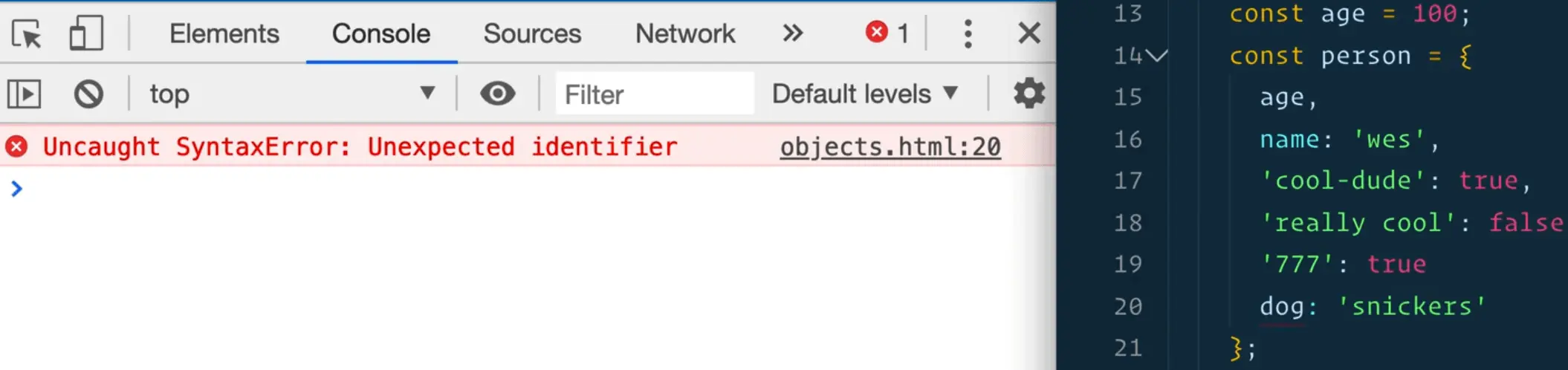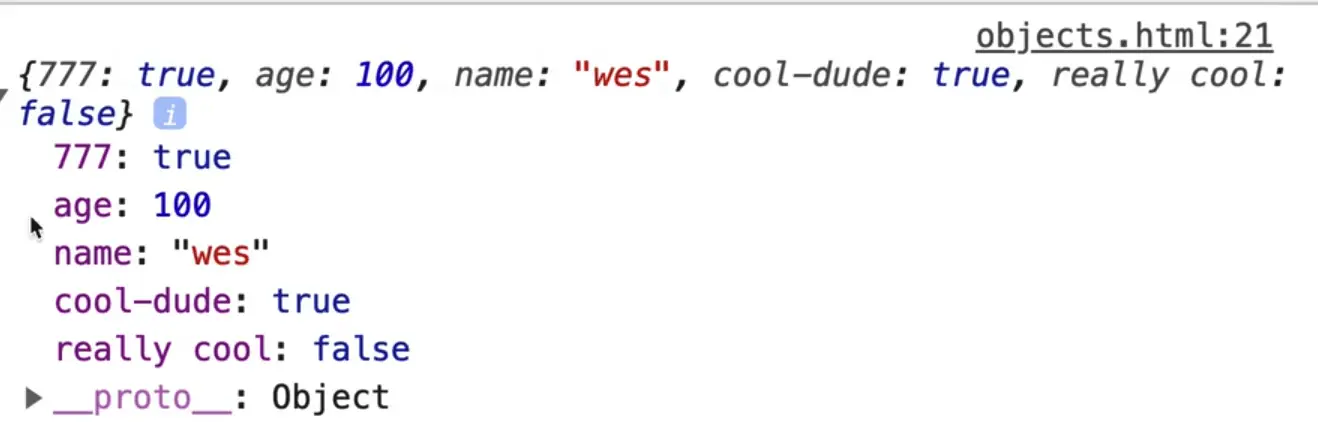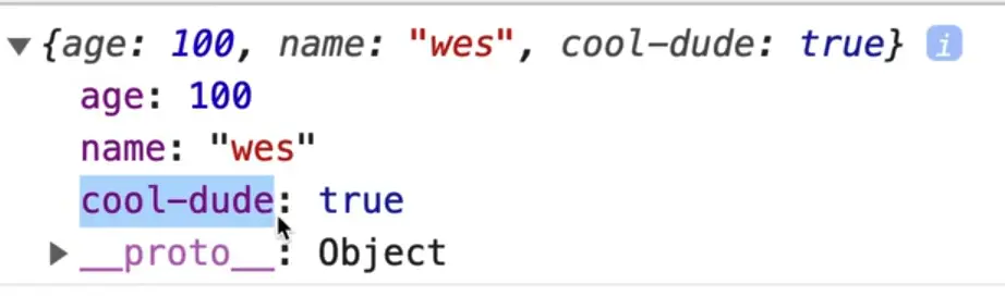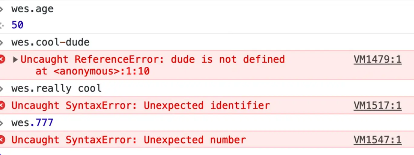 In the console, you can write wes.age and the age will be returned, however you cannot type wes.cool-dude for example because they are invalid property lookups.
