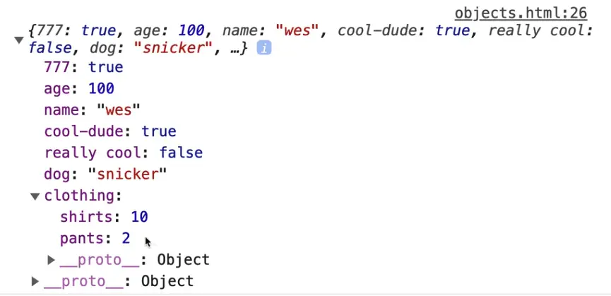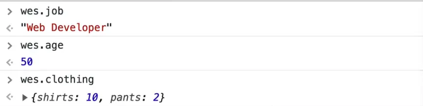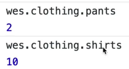 For example you would write wes.clothing.pants to return the value of the pants property within the children object that is nested within the wes object.