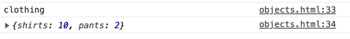 Other things you can do is add nested properties or nested objects. For example, you can create a property called clothing and assign it a sub object like so 👇