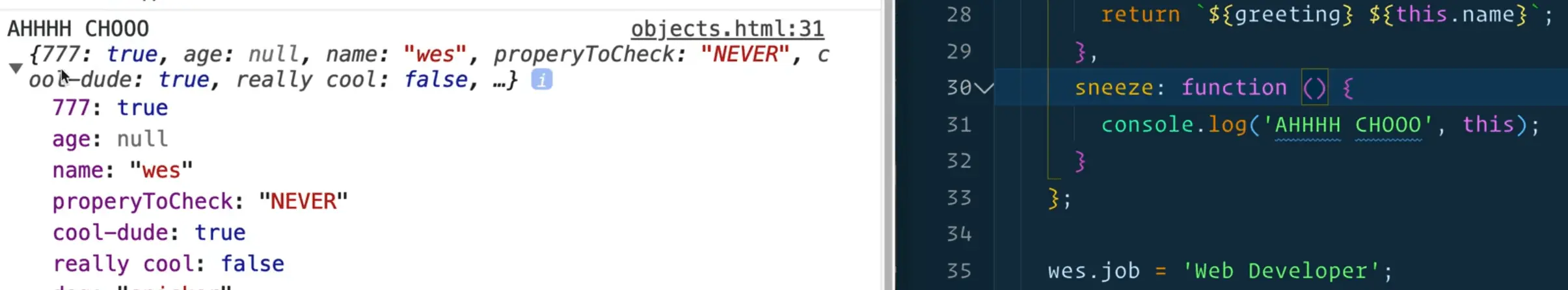 Now if you refresh the page, open the console and type in wes.sayHello(), you should see "Hey Wes" in the console.