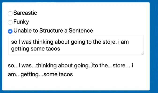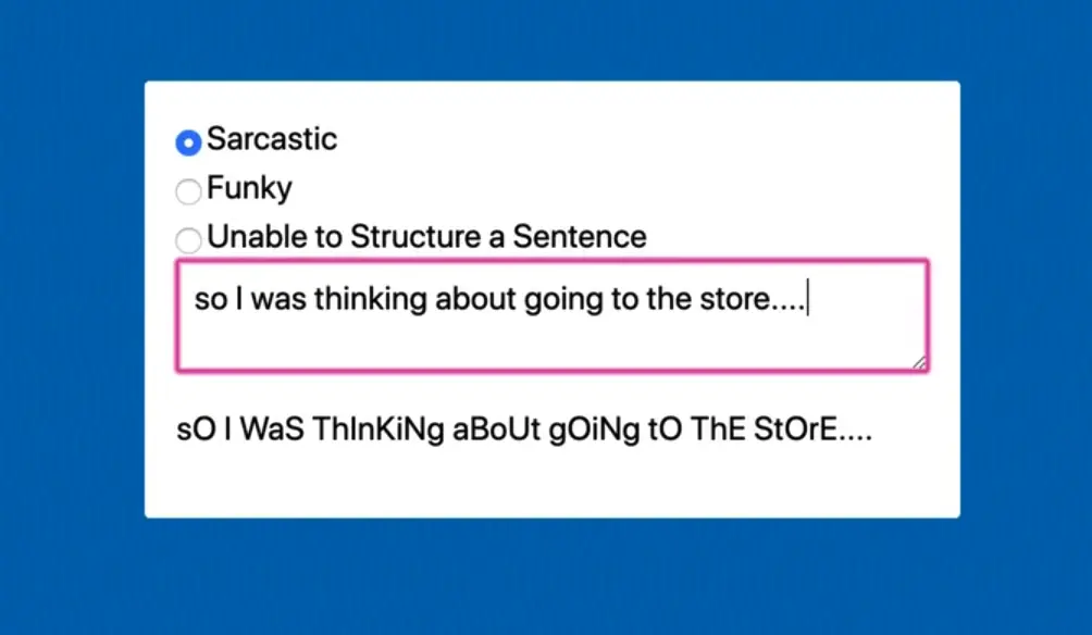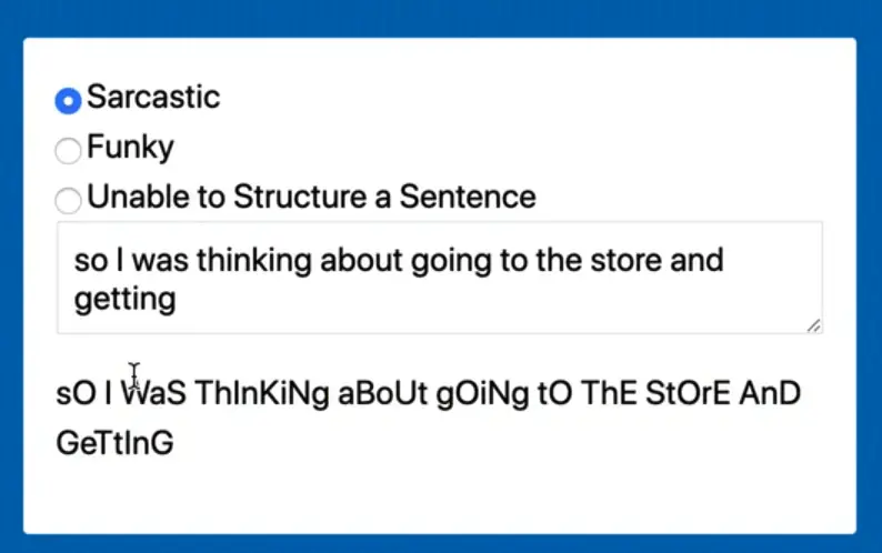 What we will be doing is building a sarcastic text generator where you can enter some text and then select one of 3 options: