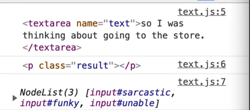 The only thing we need to know about the inputs is they all have the same name attribute value. That allows us to only select one of the radio buttons at a time. We are going to be using their values (sarcastic, funky, or unable) to pull the specific filters.