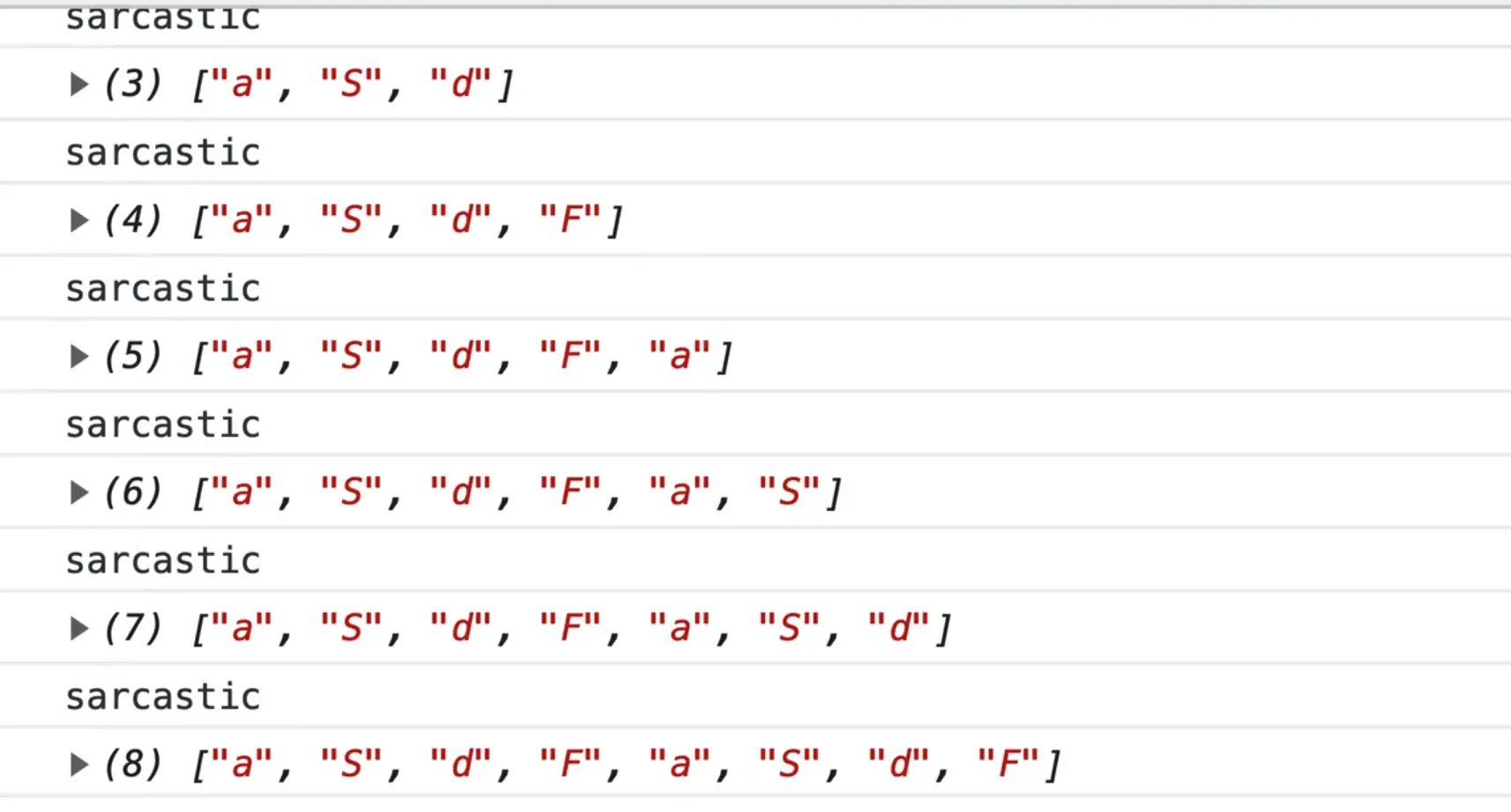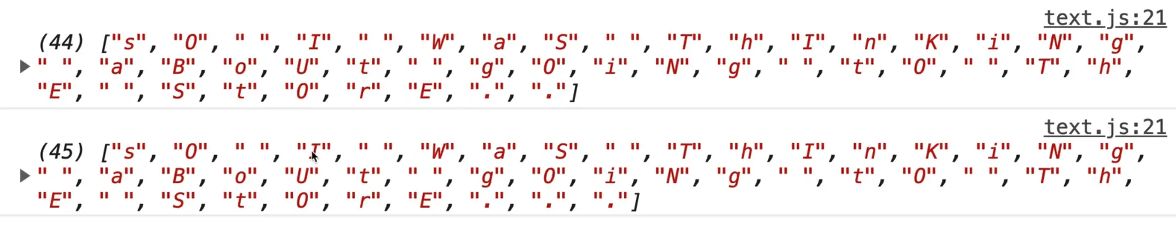 Now when you type, as you can see, we are logging the letter and the index. What we can do is say if it's an even number, lowercase it, and if it's an odd number, uppercase it.