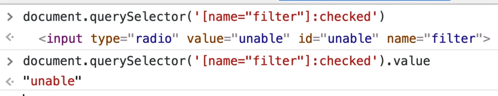 const filter = Array.from(filterInputs).find((input) => input.checked).value;
