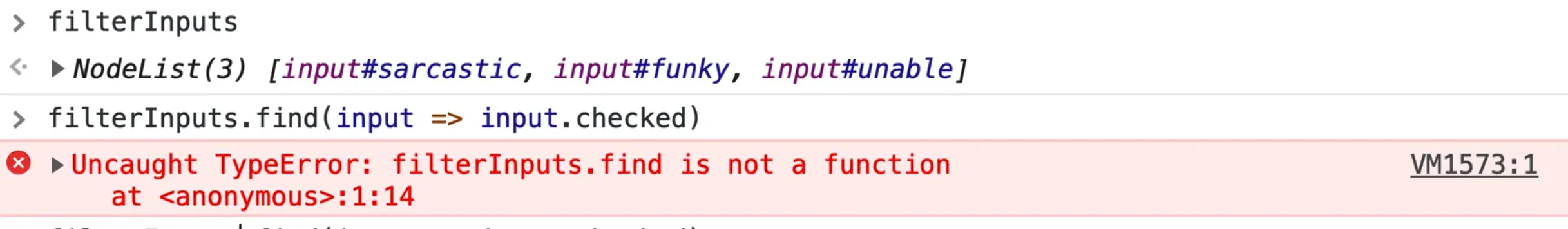 That is because filterInputs is a NodeList, not an array. We could wrap it in Array.from and then call find like so 👇