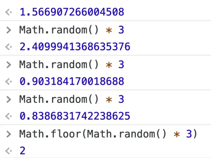 The way that we can do that is using Math.random() * 3. That returns a number with decimals so we need to wrap it in a Math.floor().