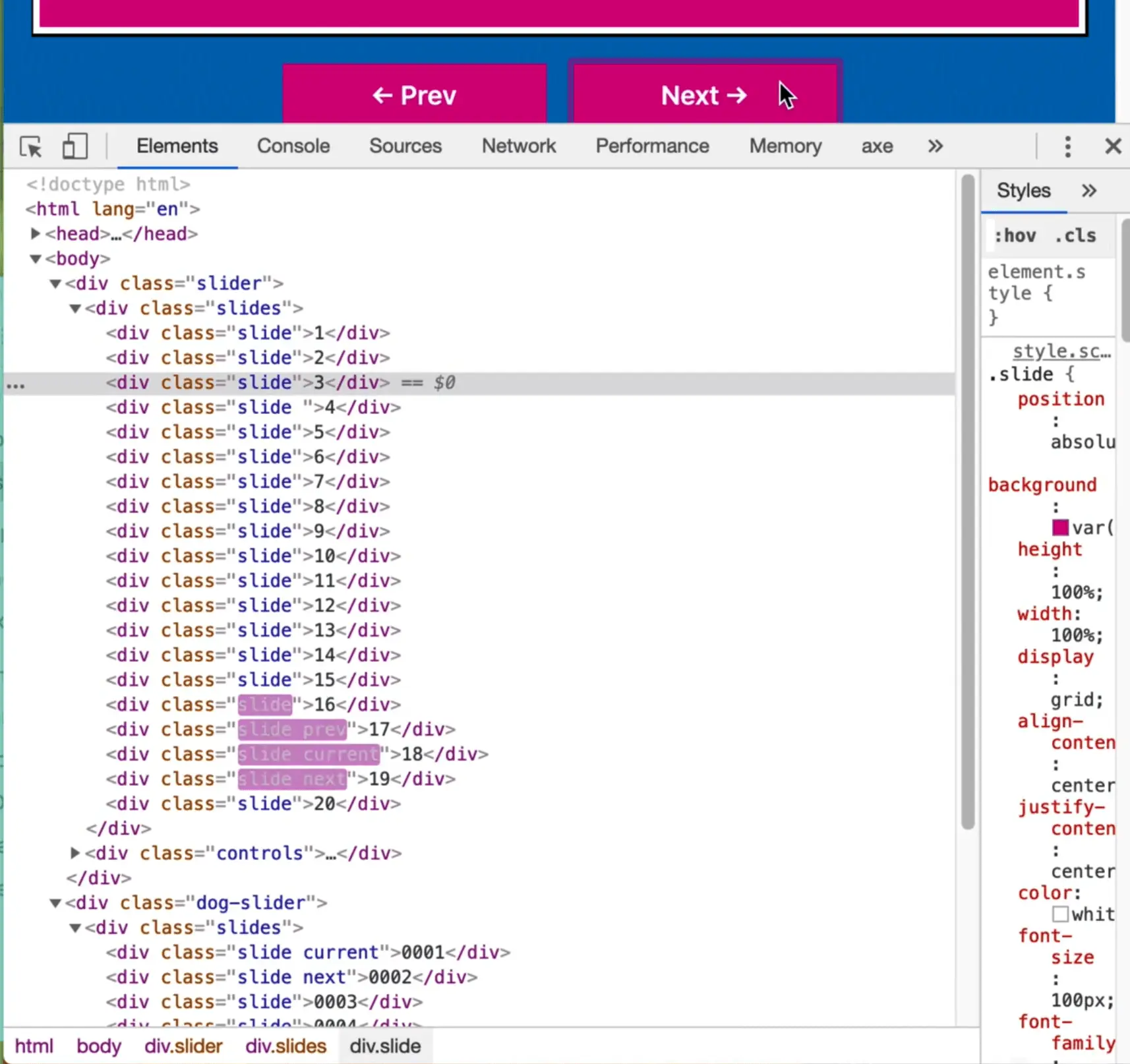 If we look at the HTML structure of the slider within the element tab of the dev tools, you will see that we have all 20 slides. Now as we hit the next button and previous buttons, the classes are actually changing on the sliders depending on what button you press.