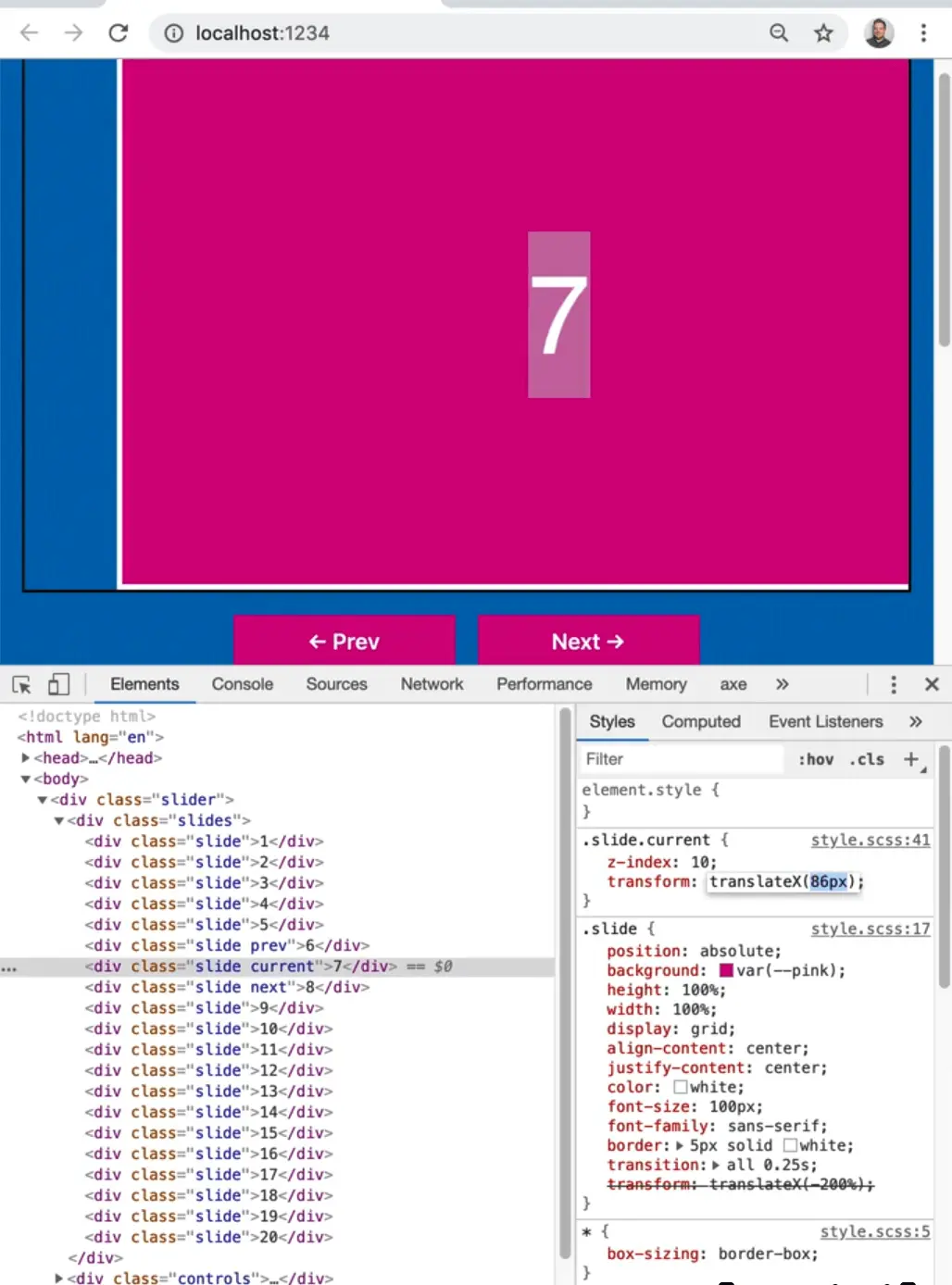 Our current slide has translateX(0), which puts it in the middle. As we modify the value that we pass to translateX, you will see the slide is moving.