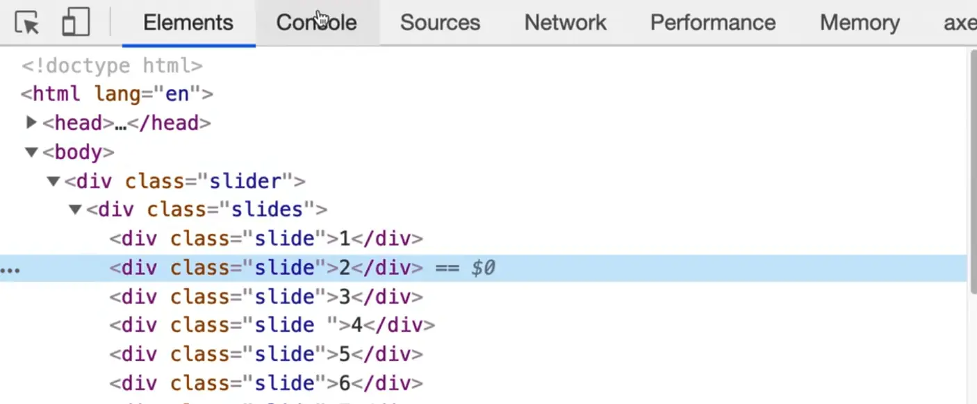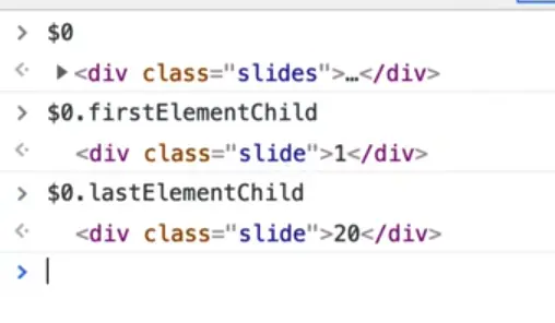 Let's demo how that works by going to the HTML page in the browser, selecting slide #2 in the elements tab and then going back to the console and typing $0.previousElementSibling. You will see that the slide that says 1 will be returned.