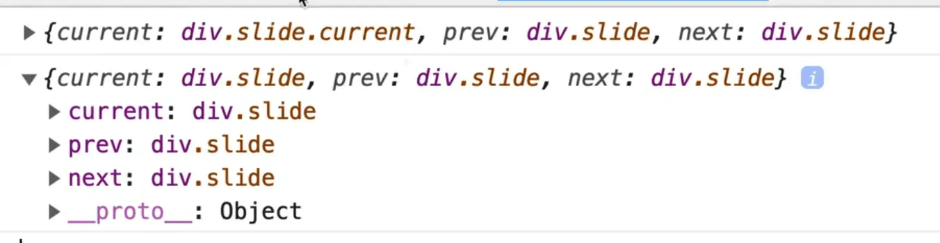 Next will be next = current.nextElementSibling || slides.firstElementChild;. Then we will add console.log({current, prev, next });