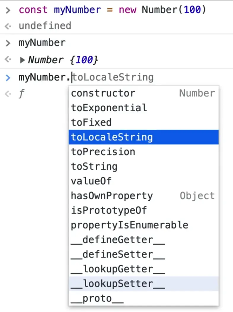 That is why we say in JavaScript everything is an object. Even though a number is just a number, when we create a new number, we have all these methods that exist on it. So although the number is just a number, it is packed with all these methods for working with it.