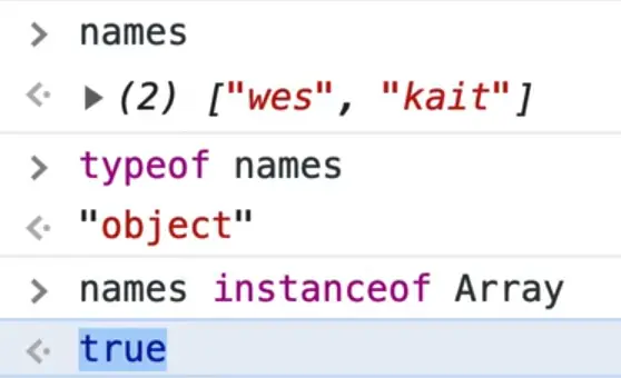 If you try running typeof and instanceof Array in the console, you should see the same result -- names is an instance of an array but an object itself.