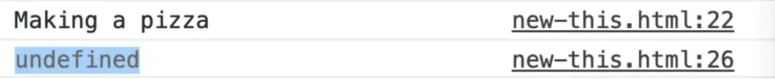 Add the new keyword as shown above, and when you check the logs you will see that we get a pizza object with nothing because we haven't added anything to it yet.