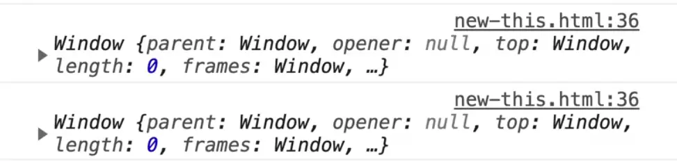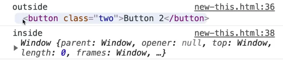 Let's log the value of this within the timeout, refresh the page and click the second button and then look at the console. You should see the button logged and then the window.