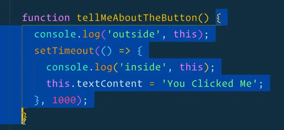 An important thing to know about the this keyword is that it is always scoped to a function. If you use an arrow function, for example if we converted tellMeABoutTheButton to an arrow function as shown below, watch what happens to this.