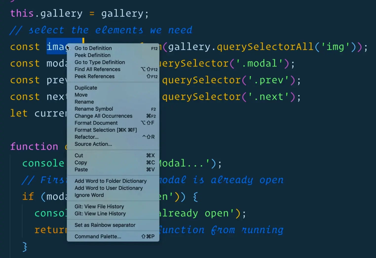 The easiest way that Wes has found to do that is to right click on a variable name in VSCode and select "Rename symbol". Then add this. next to const image and remove the const, because we are not declaring a new variable, we are simply setting a property on the gallery instance.