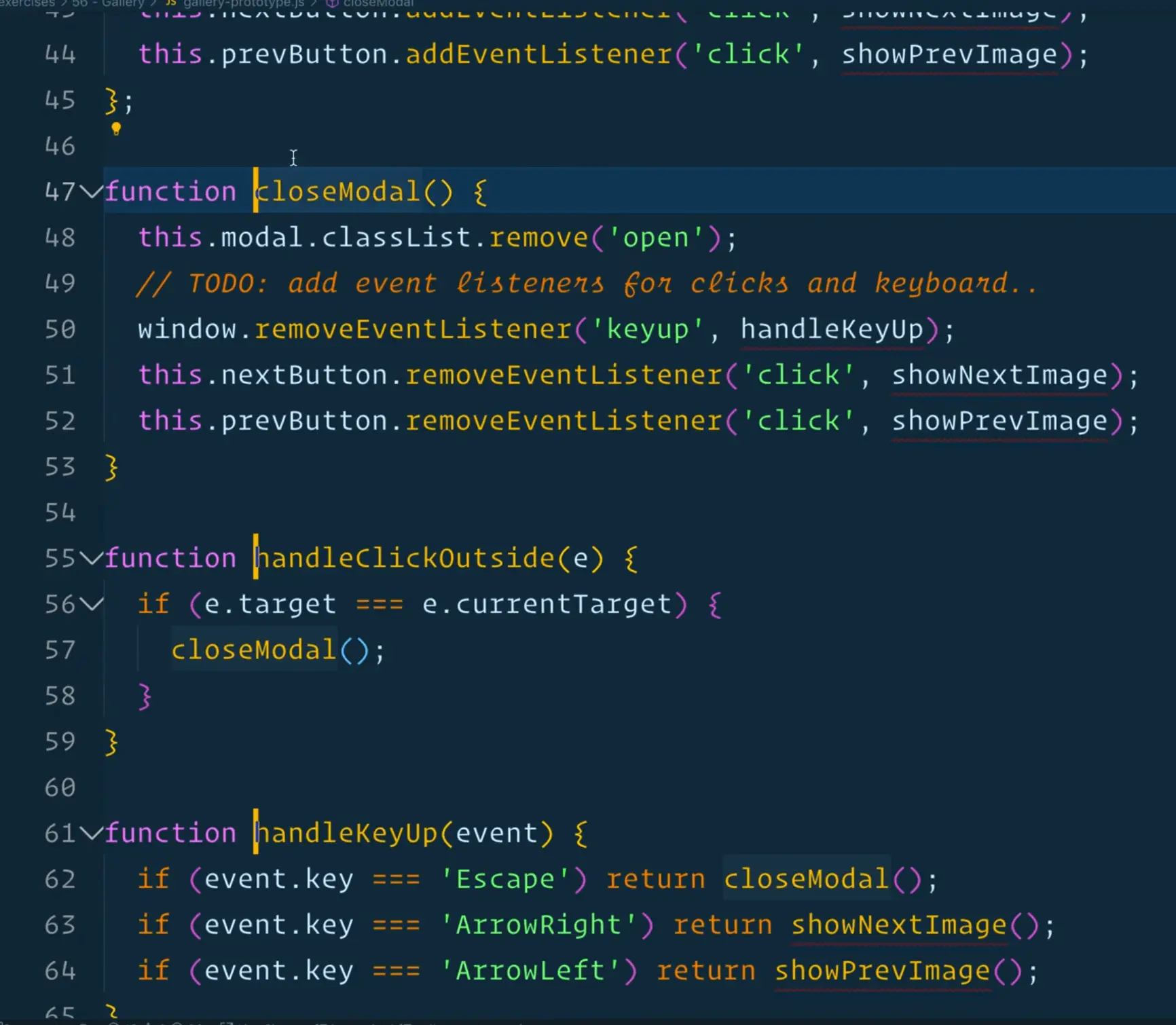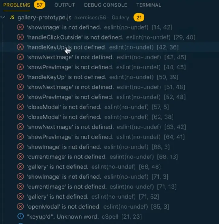 We will do that for handleKeyUp, showNextImage and showPrevImage because they are the ones giving us trouble.