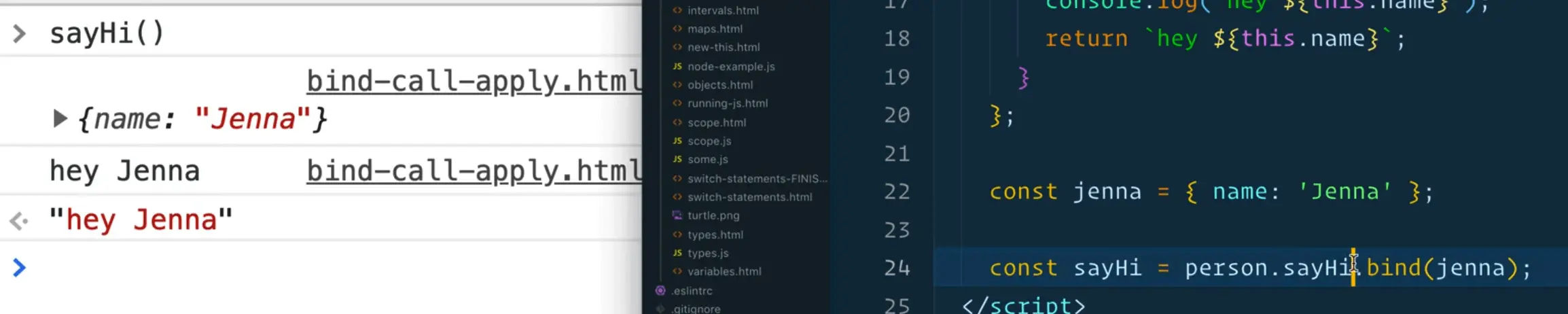 This lesson will focus on the bind, call and apply functions, which are all used to change the scope of what this is equal to inside of a function or a method.