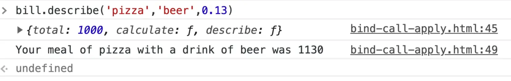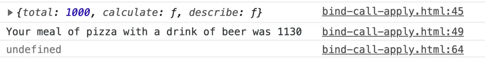 const myMeal = bill.describe.call({ total: 342 }, 'pizza', 'beer', 0.13);