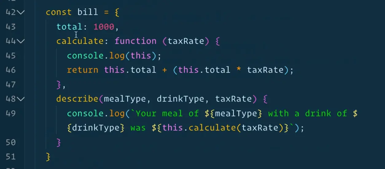 console.log(`Your meal of ${mealType} with a drink of ${drinkType} was ${this.calculate(taxRate)}`);