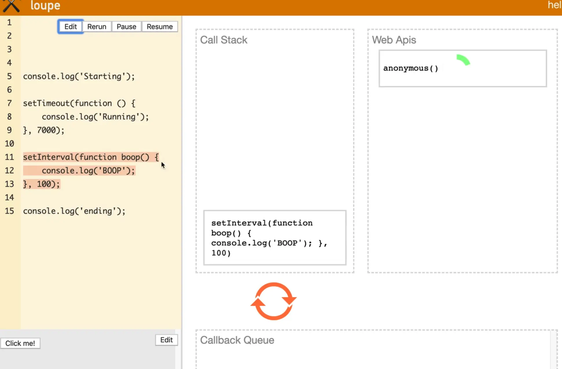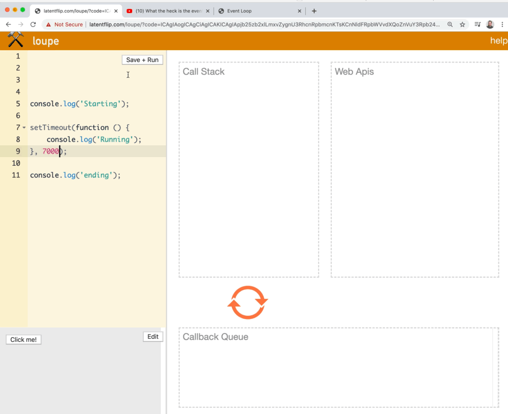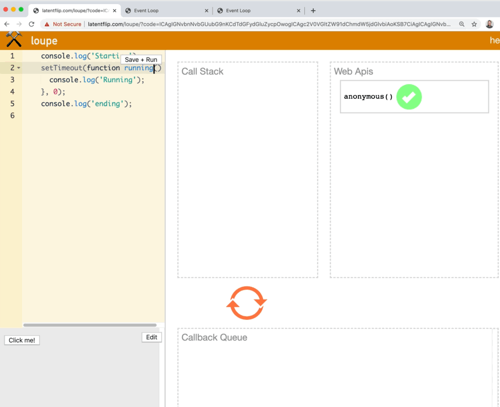 Let's run the default example on loupe that is supplied to demonstrate what happens when multiple things are queued up.