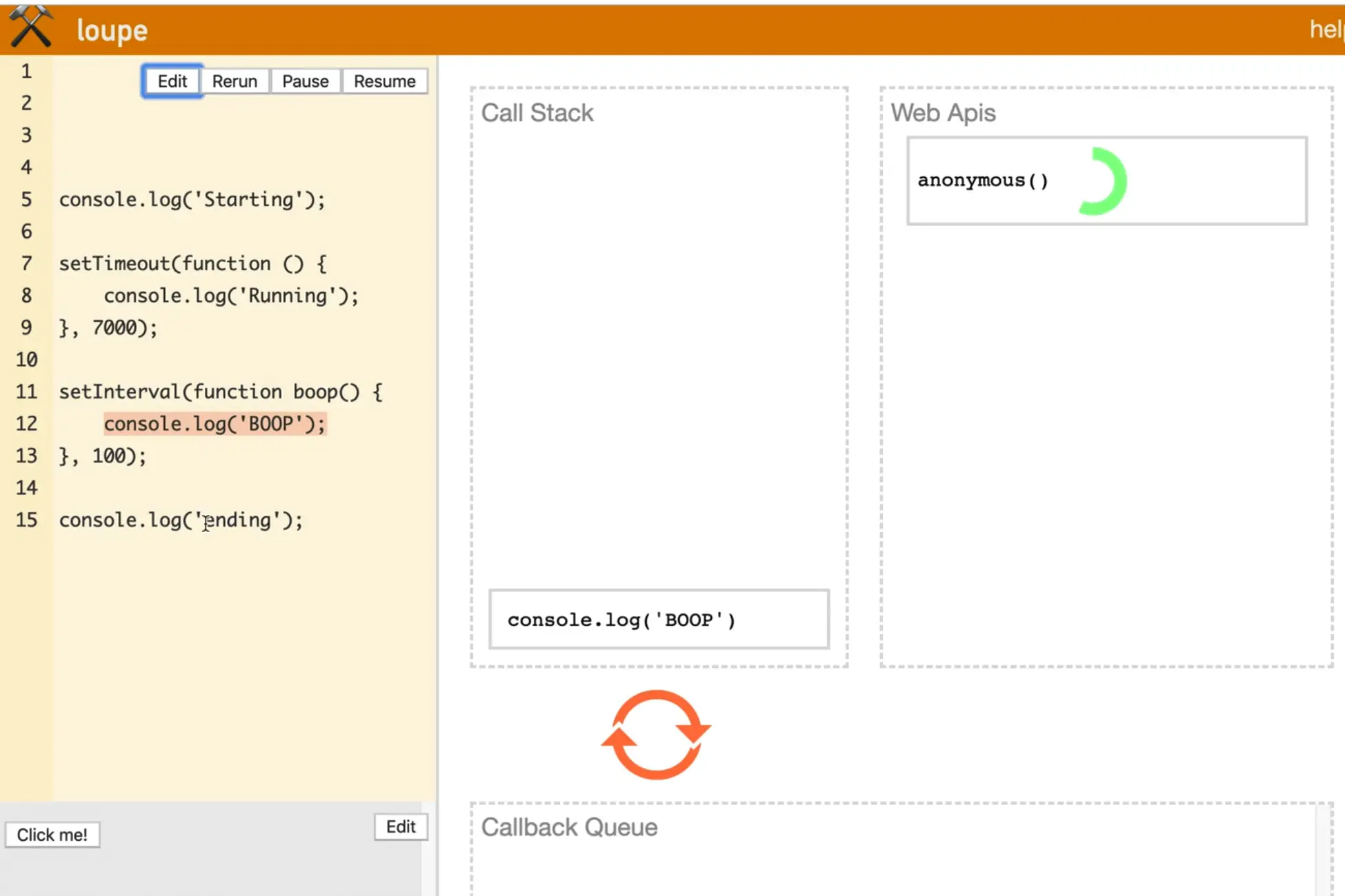 Let's say after the setTimeout we wanted to add an interval that logs BOOP every 100 milliseconds. Name the function boop so we can visualize it more easily.