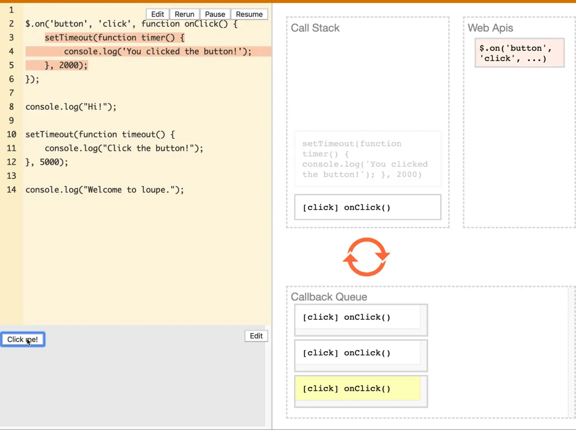 When you click a button, we set a timer for 2 seconds that says you clicked me, then it logs "hi" then another timer is set for 5 seconds, and then it logs welcome to loupe.