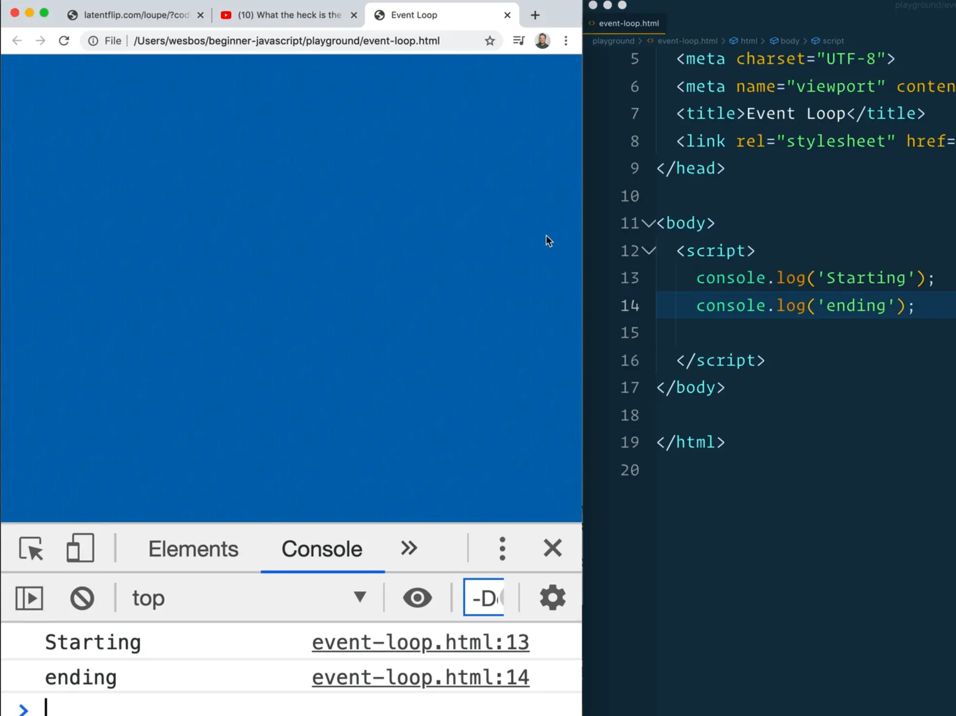 Open up the event-loop.html file within the exercises/ directory. Add two logs within the script tag and then refresh the page to check them.