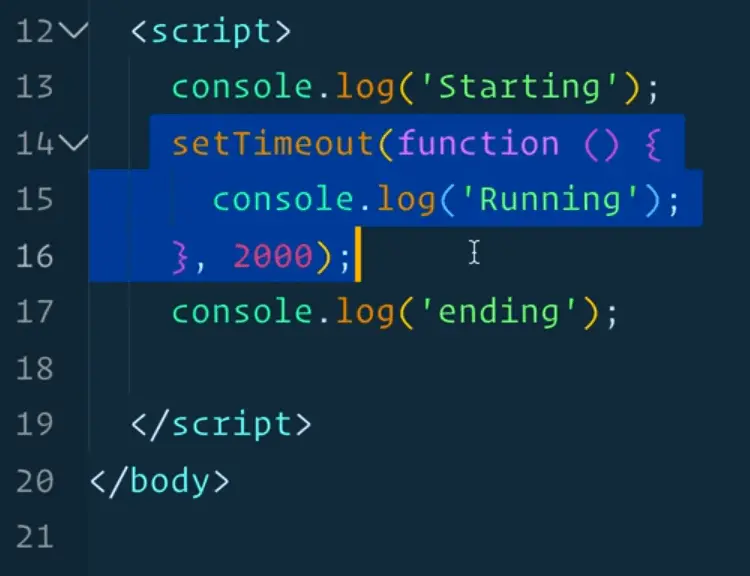 Next, it will parse the next few lines which is the setTimeout() function. It will say "okay I won't do anything yet but after two seconds I will come back to this code".