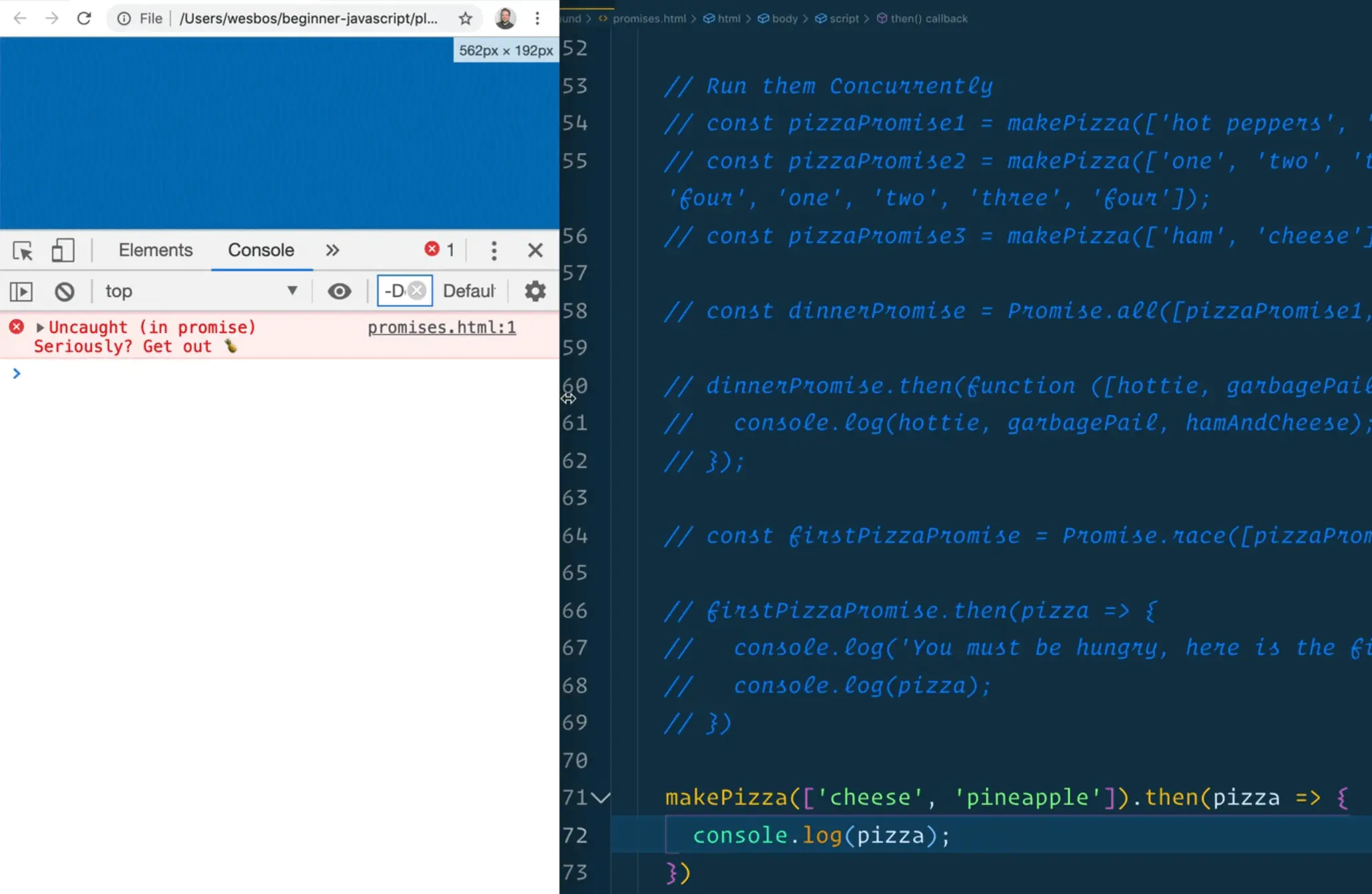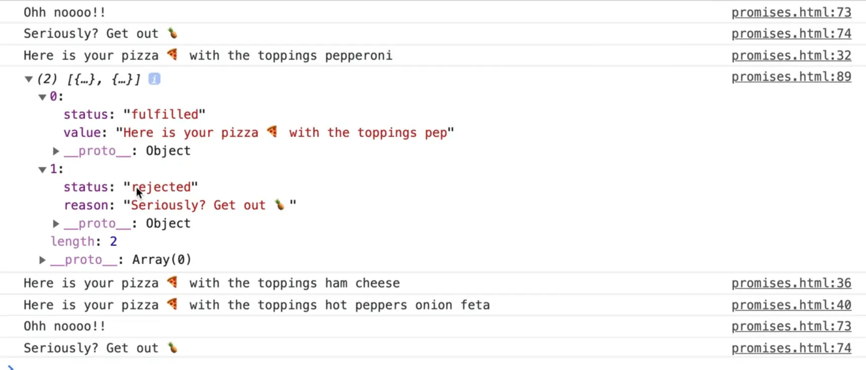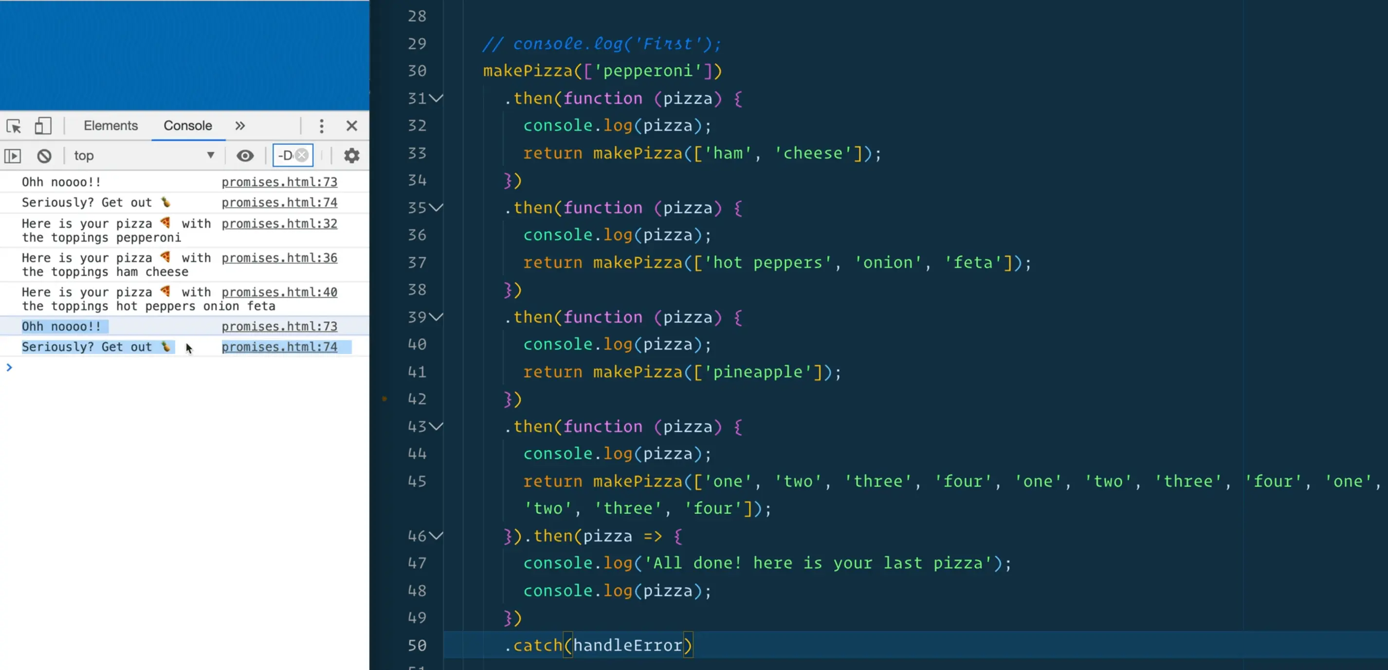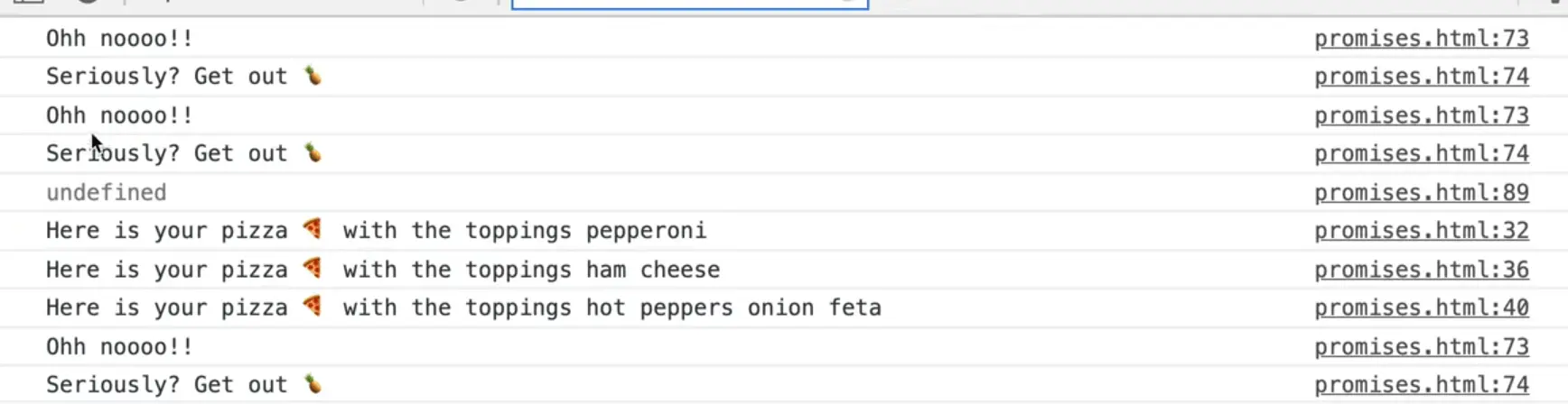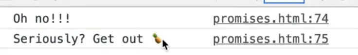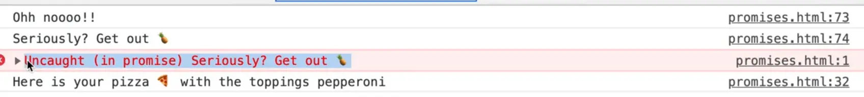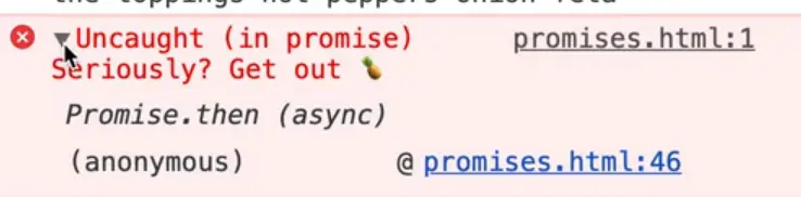What happens there is we go through the chain of promises and then as soon as we hit the code where we try to make a pizza with a pineapple we get the "uncaught in promise" error.