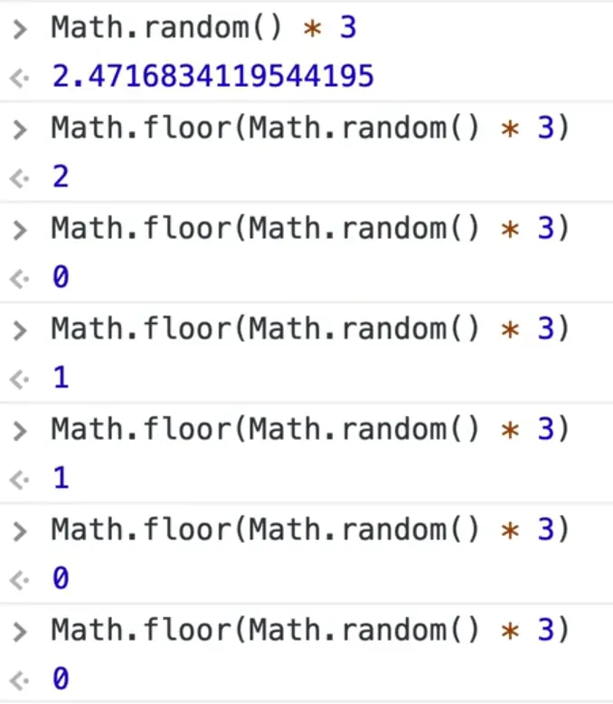 We already know that you can calculate a random number using a combination of Math.floor and Math.random like Math.floor(Math.random() * 3).